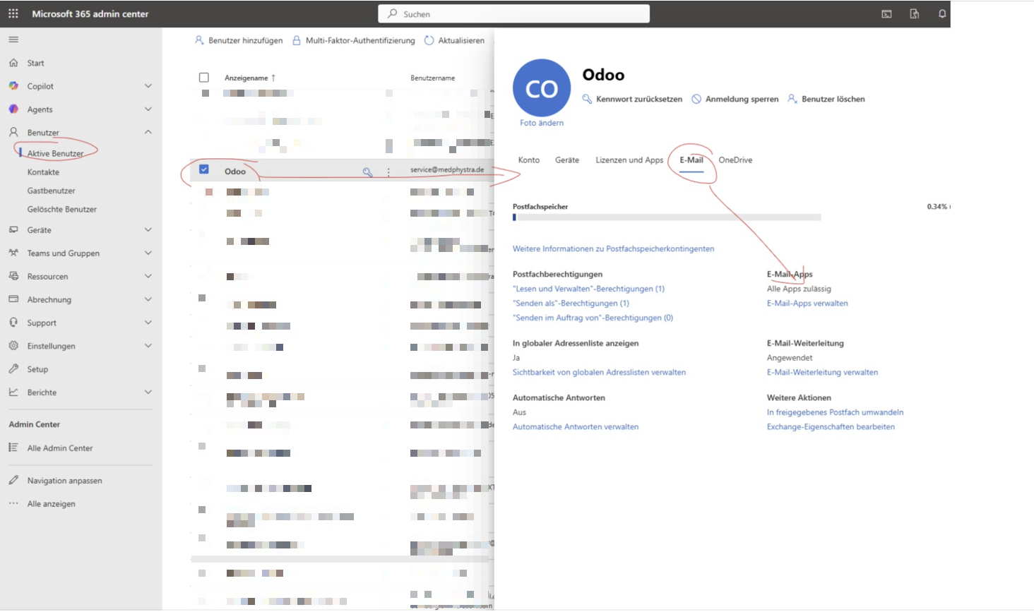 Schritt 1: Den Odoo-Servicebenutzer im Admin Center öffnen